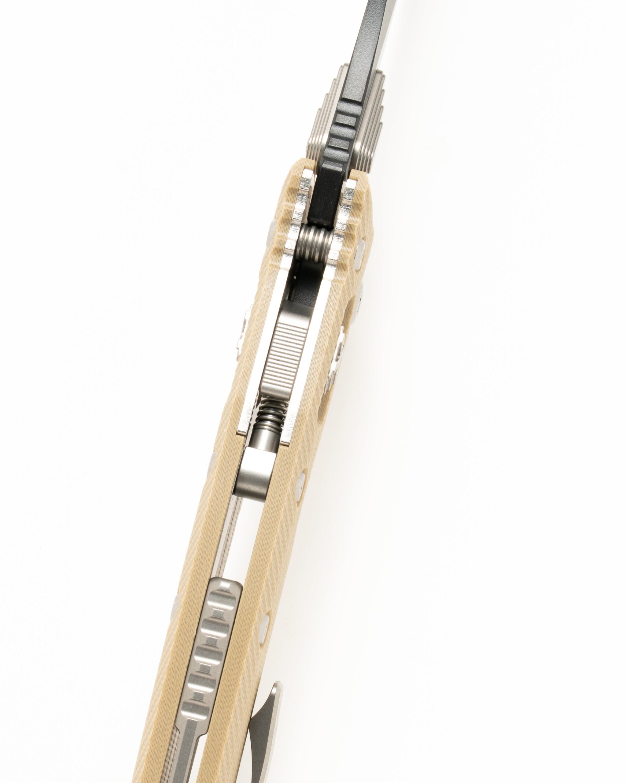 Obojživelník RAM-LOK manuálny priečinok v hnedej farbe s čiernou DLC čiastočne zúbkovanou čepeľou M390MK s jedným ostrím. Drážkovaná hliníková rukoväť s tyčovým zámkom RAM-LOK. 3,90″ čepeľ, celková dĺžka 9,25″, 5,9 oz.