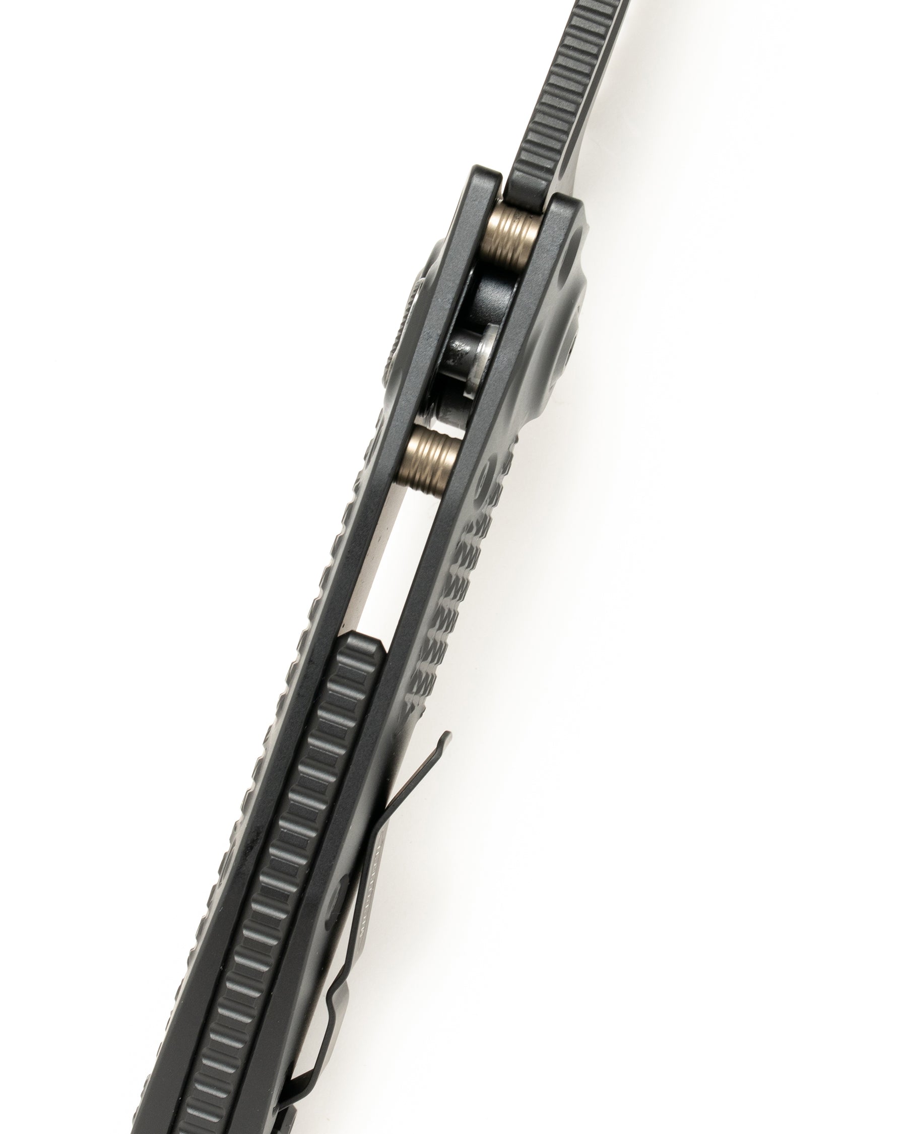 Automatický stehovací nôž s čiastočne zúbkovanou čepeľou M390 potiahnutou DLC. Spolupráca medzi Marfione Custom a Borka Blades. Vrúbkovaná hliníková rukoväť, 3,75″ čepeľ, celková dĺžka 8,51″, 6,3 oz.